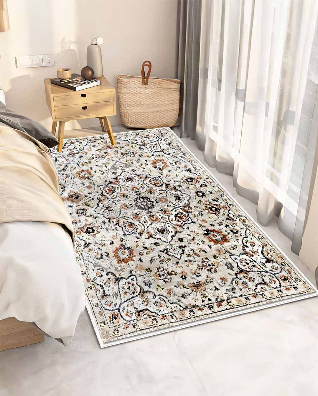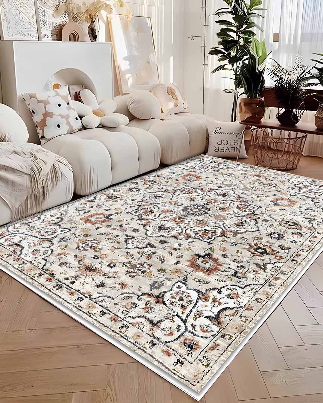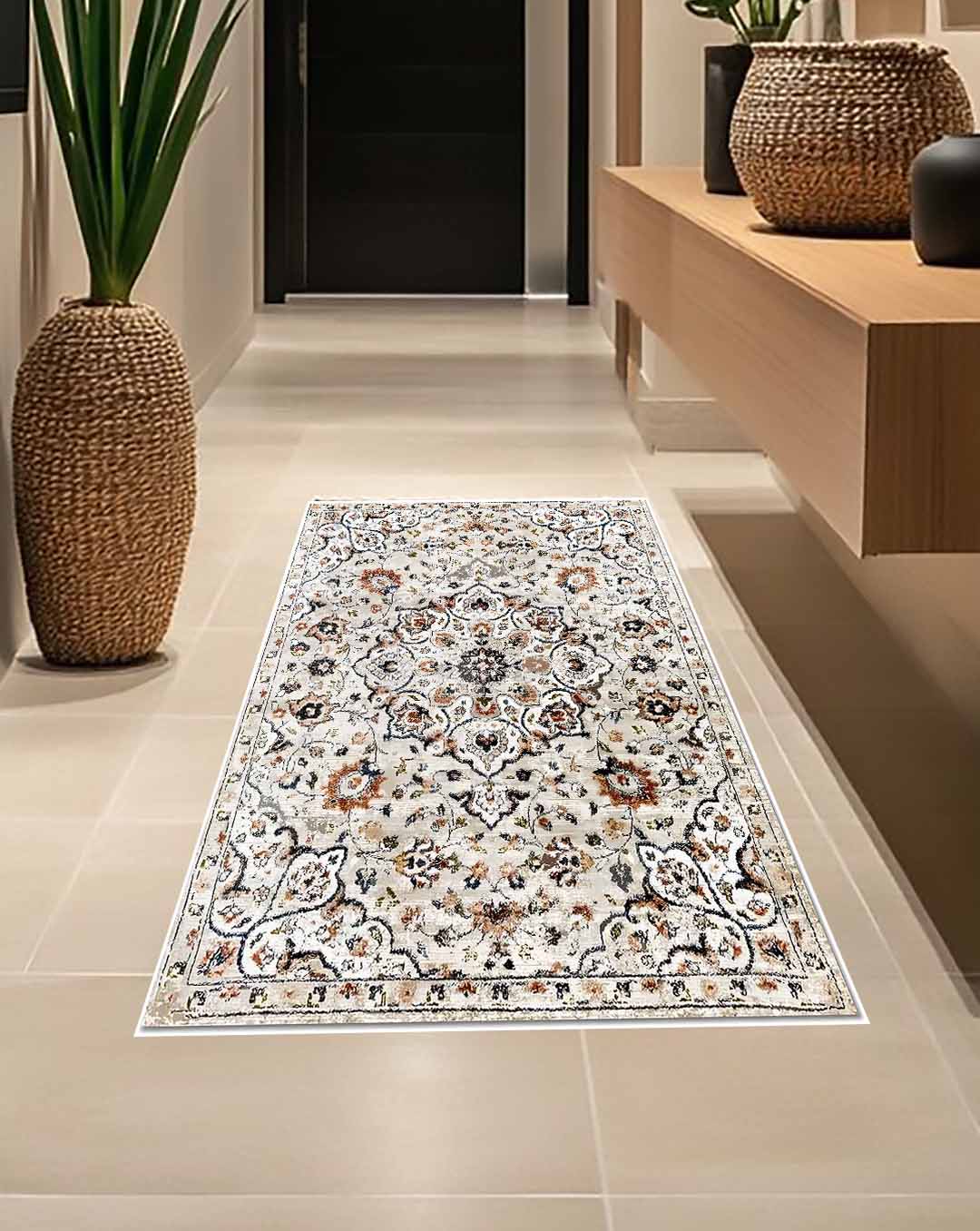 Huda is a vintage persian new style carpet has light Beige carpet background and mixture of floral and classic curves in the most trending and modern colours mixtures that can unfortunately change area mode and style ,it's the best choice for livingroom carpet , bedroom runners and bedroom carpet and door mat. Easy cleaning make it beats all other carpets as it's washable carpet ,  Enjoy softness touch with the best colours and anti-slip back would make it the best choice ever for high and  medium-traffic zones, kid and pet-friendly carpet and homes.