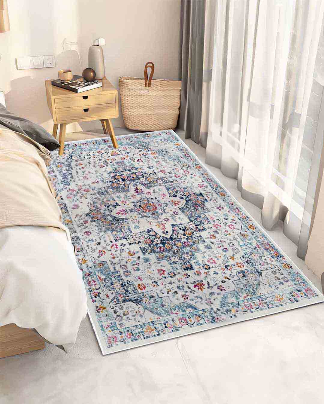 Ema is a vintage persian new style carpet has light Beige carpet background and mixture of floral and classic curves in the most trending and modern colours mixtures that can unfortunately change area mode and style ,it's the best choice for livingroom carpet , bedroom runners and bedroom carpet and door mat. Easy cleaning make it beats all other carpets as it's washable carpet ,  Enjoy softness touch with the best colours and anti-slip back would make it the best choice ever for high and  medium-traffic zones, kid and pet-friendly carpet and homes.